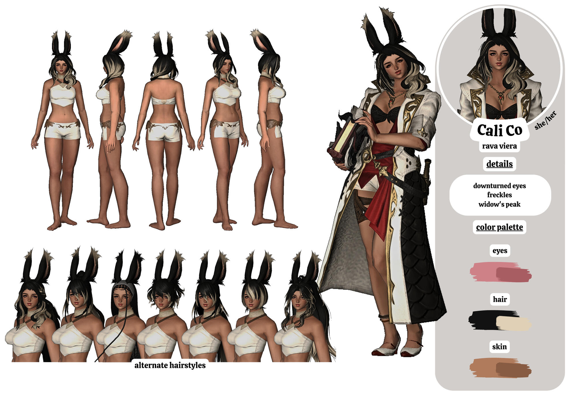years later, the garlean empire's expansion created a reason for cali to leave her birthplace. even with this being uncommon for viera of the jungle, as they abide by the Green Word, cali knew from youth that the Word would not always be the way she would live her life. deep inside she knew she wanted to go out into the world. So, in search of safety, friends, new family, and her very own fat cat, she made her way to Limsa Lominsa. Her goal was simple- become an arcanist, maybe even specializing summoning!Little did she know, she would not be settling down - life had far greater plans for her than just learning to summon her own fat cat.